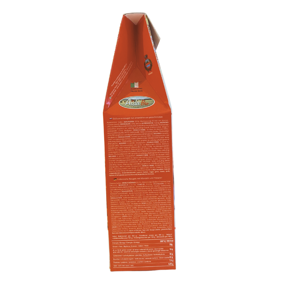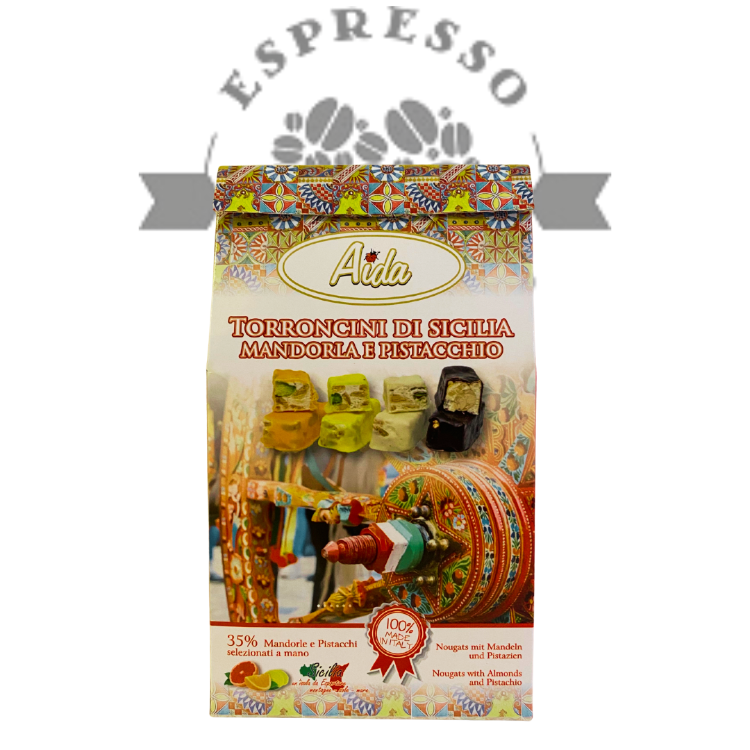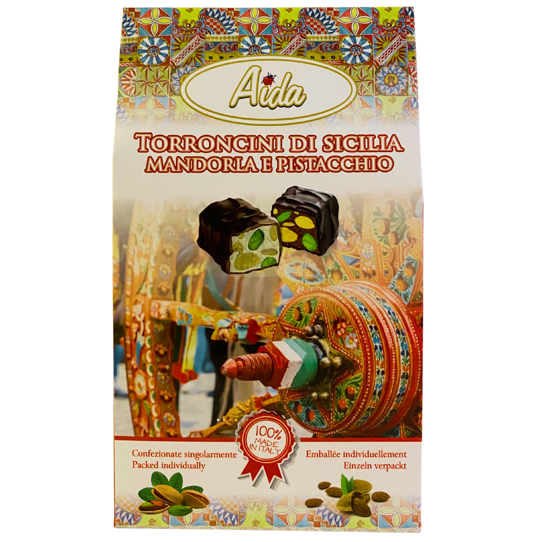 Die Torroncini von Aida vereinen feinen Nougat mit Erdnüssen (20 %), Pistazien (18 %), Mandeln (15 %) und aromatischem sizilianischem Honig. Überzogen mit dunkler Schokolade, weißer Schokolade und Zitrusglasuren in den Sorten Vanille, Limone, Arancia und Gianduia, sind diese kleinen Würfel ein Genuss für alle Sinne.