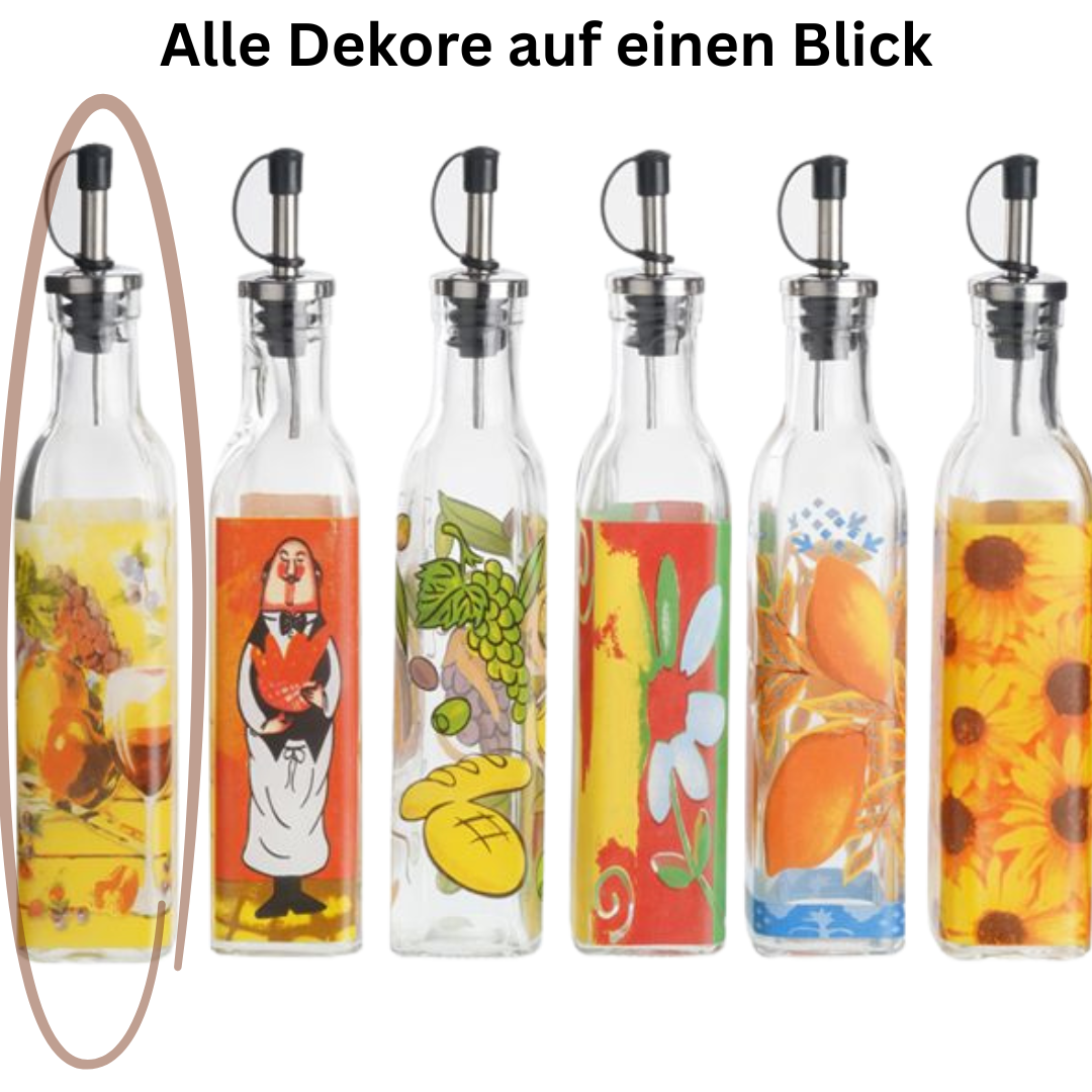 • Material: Glasflasche mit Dekor, Edelstahl-Ausgießer